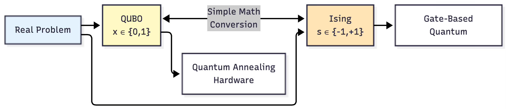 QUBO (0/1) and Ising (+1/-1) formats translate problems for quantum computers