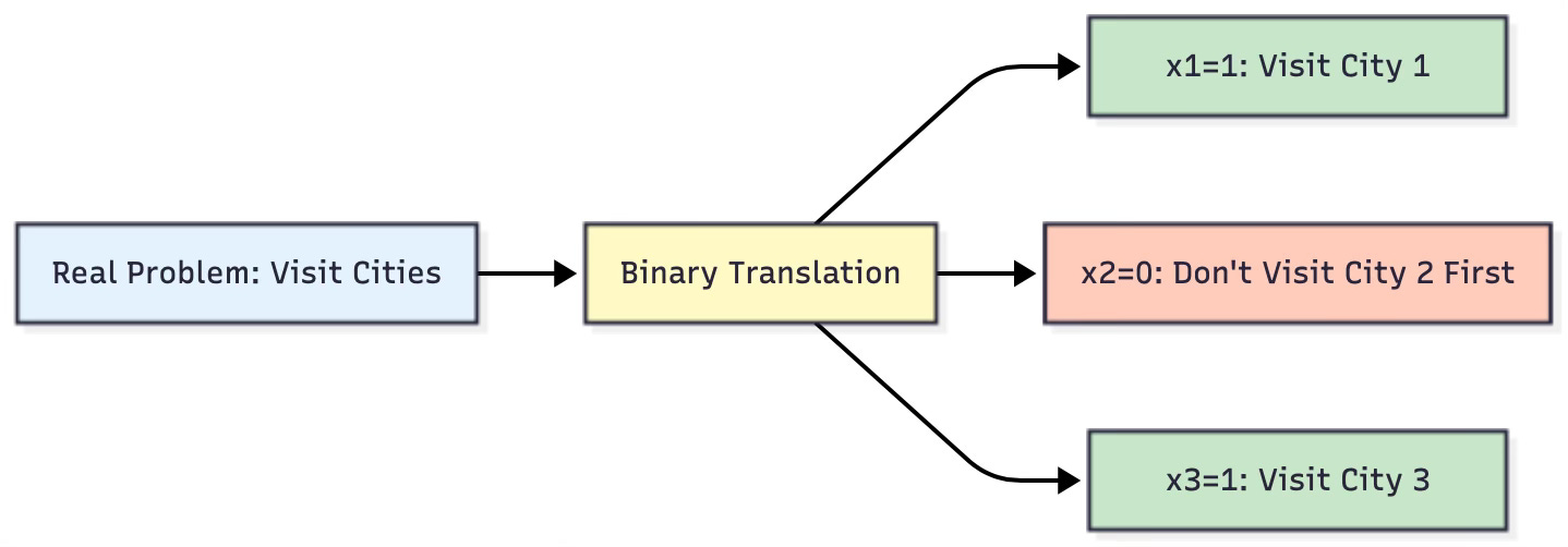 Quantum computers don’t understand road trips, city names, or distances. They only understand quantum bits (qubits) and quantum physics. So we need to translate our everyday problems into a language quantum computers can work with.