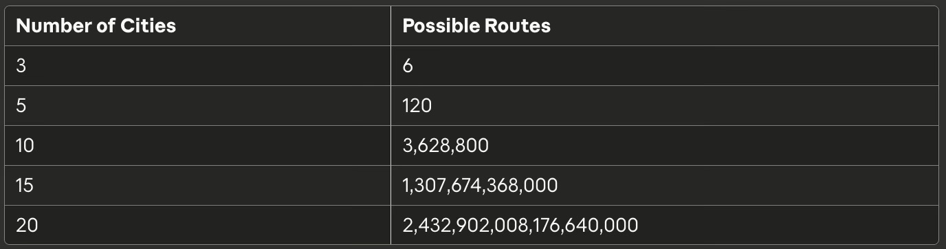 This is called exponential growth - the number of possibilities explodes as the problem gets bigger. Even if you could check 1 billion routes per second, checking all routes for 20 cities would take over 77 years!